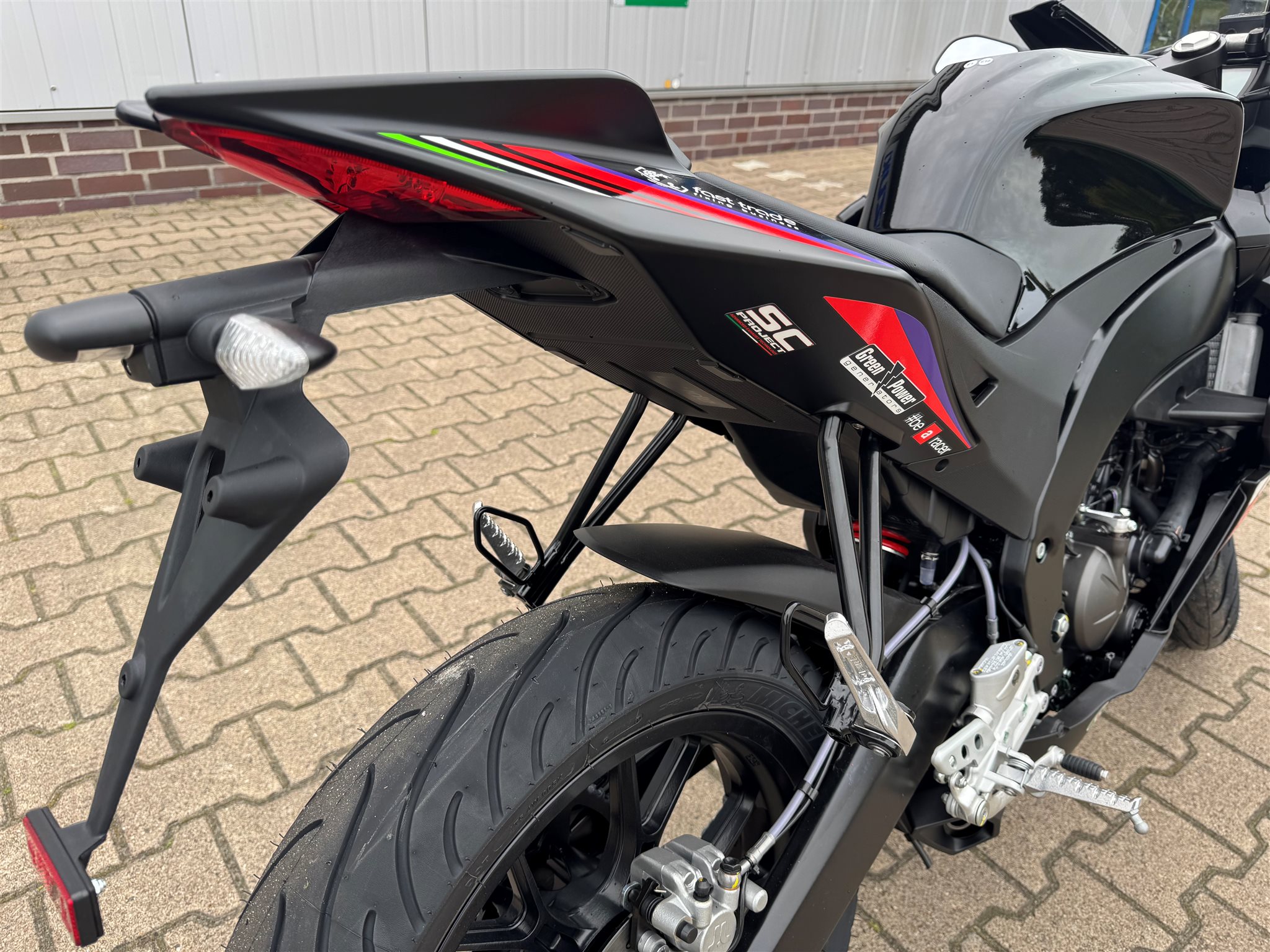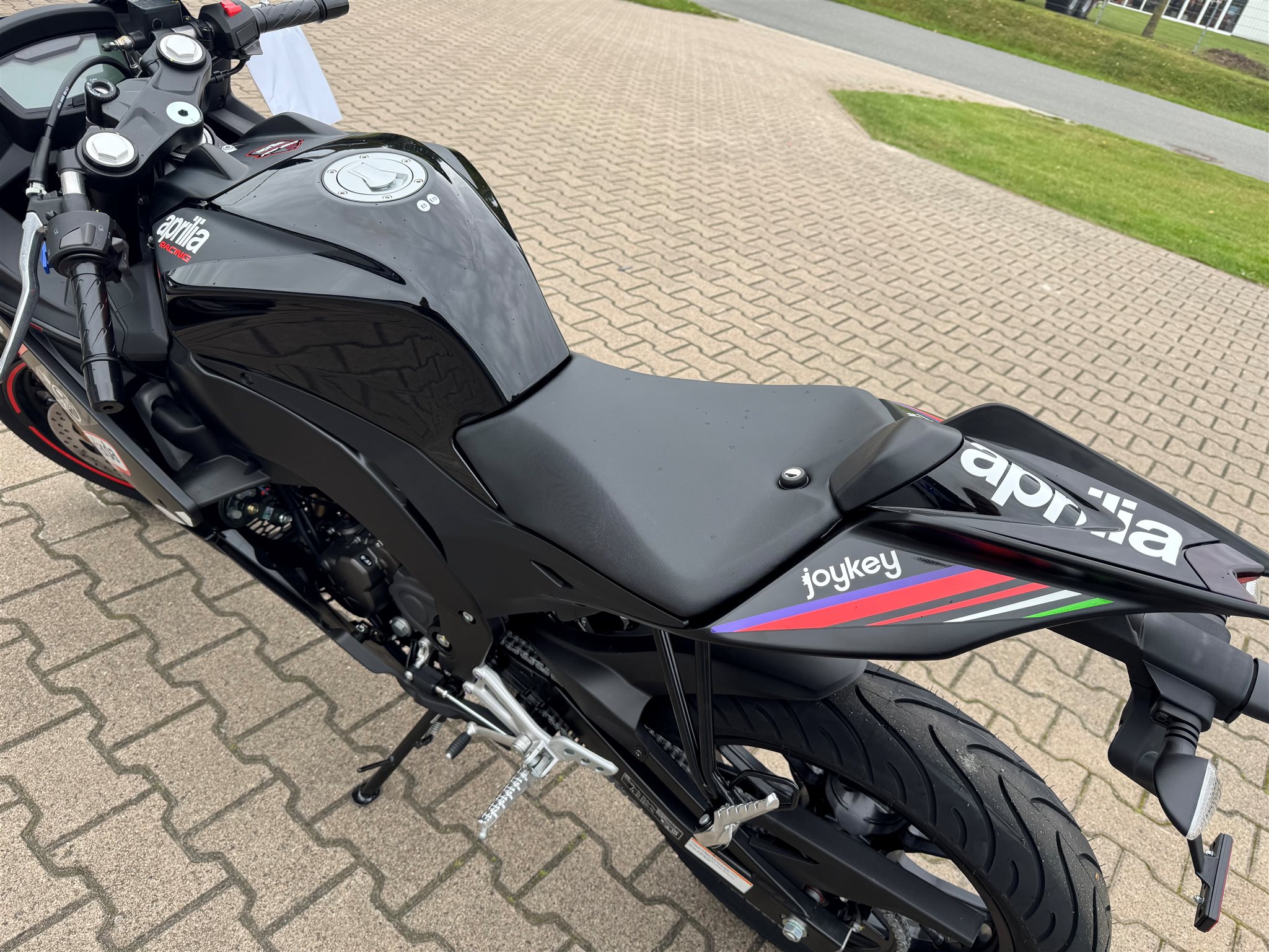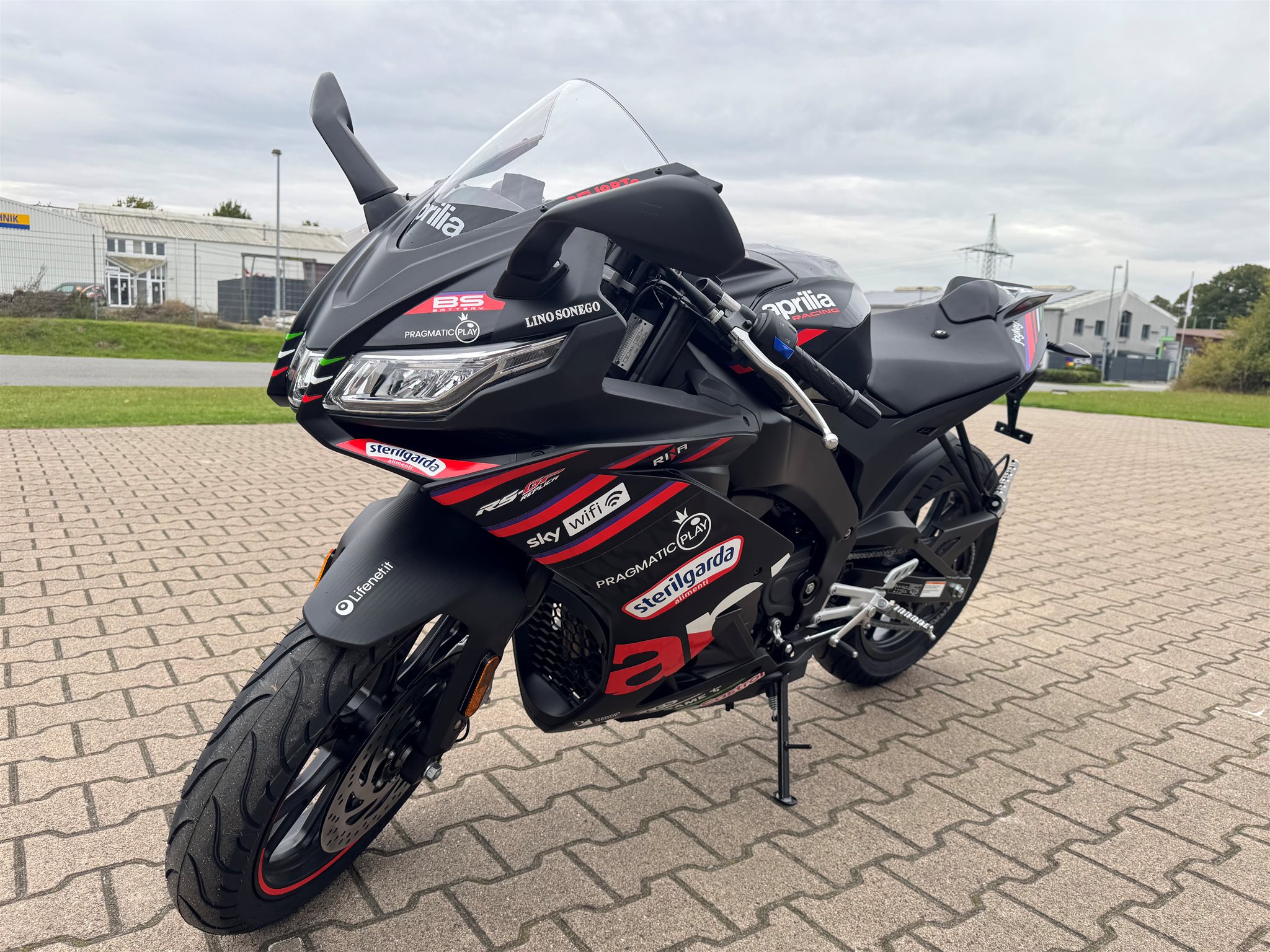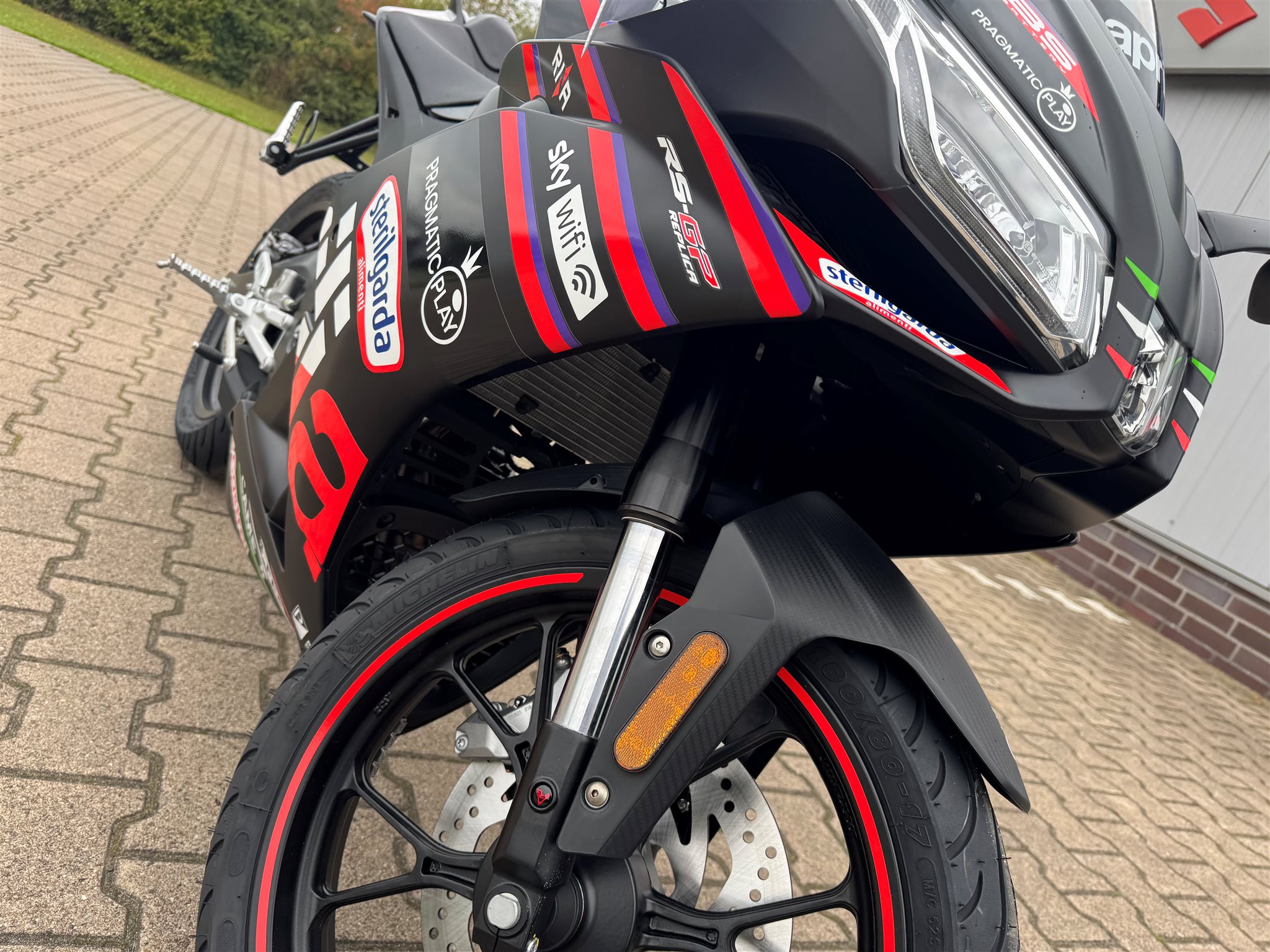 Ausstattung Zweikanal-ABS mit Stoppie Control. Full LED Scheinwerfer und Blinker. Aprilia